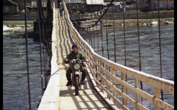 В здешних местах люди давно пытаются совладать со своенравной Бирюсой. В расположенной неподалеку деревне Соляной на правом берегу реки до недавних пор располагался процветающий леспромхоз. Там были построены школа, Дом культуры — словом, все объекты соцкультбыта. Для связи с левым берегом еще в далеком 1960-м году литовские строители возвели уникальное инженерное сооружение — настоящий вантовый мост. Правда, деревянный. А дерево, как известно, не самый лучший материал для подобных строений. За сорок с лишним лет опоры покосились, удерживающие их тросы с одной стороны предельно натянулись, с другой — провисли.