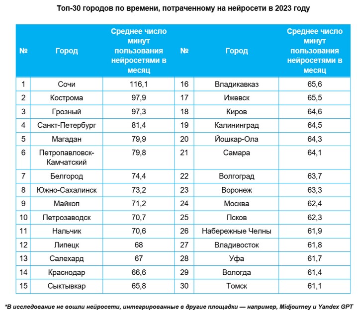 Кроме того, аналитики Yota составили топ городов, жители которых тратят на нейросети больше всего времени. Рейтинг возглавил Сочи, где в среднем абонент пользуется нейросетями почти два часа в месяц (116 мин). Также в пятерку лидеров вошли Кострома, Грозный, Санкт-Петербург и Магадан.