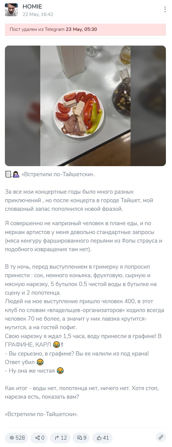 Обновлено в 12:25. Рэпер Homie удалил из своего телеграм-канала скандальную запись о тайшетском гостеприимстве. Но, как известно, в интернете ничто не проходит бесследно. Сервис TGStat сохранил его публикацию в самом первозданном виде. Поэтому сделать вид, что ничего не было и всем всё показалось, не получится.