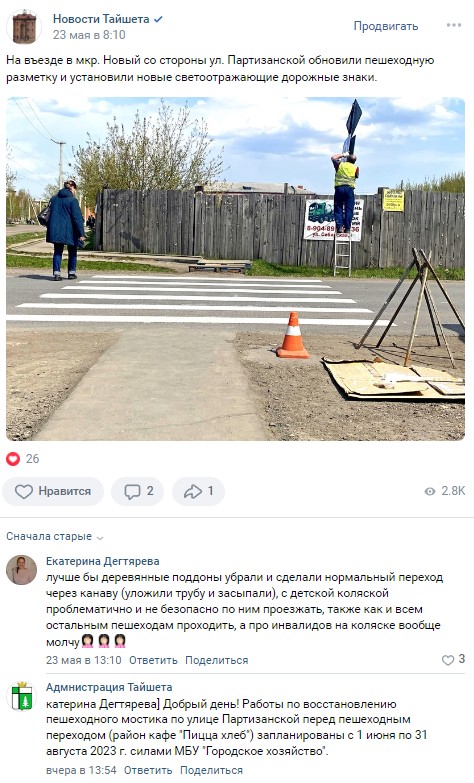 И вот вам самый свежий пример. Одна из жительниц города в соцсети «ВКонтакте» пожаловалась на состояние мостика через кювет на улице Партизанской. Над ямой там лежит поддон, что затрудняет беспроблемное передвижение по нему. Особенно с детской коляской. В ответ администрация города заявила нашей читательнице: