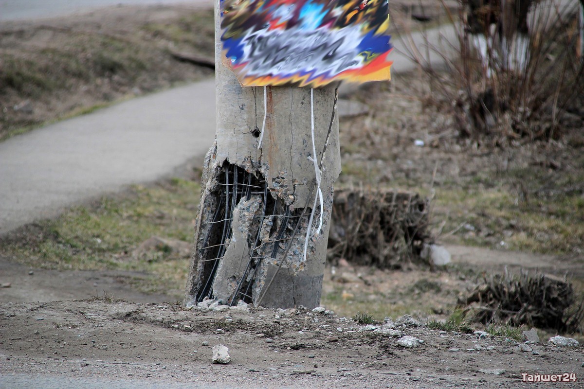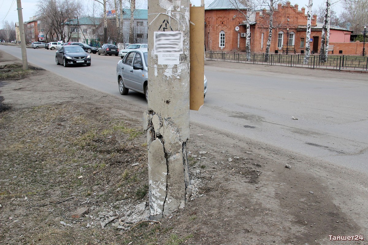 Опора линии электропередач, находящая на центральном перекрёстке в Тайшете, вот-вот готова рухнуть на проезжую часть.