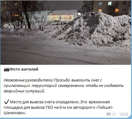 Мы читаем отчёты о кропотливой, неустанной работе этого предприятия по очистке дорог от снега, но, выезжая на улицу, понимаем, что местные глашатаи говорят о каком-то другом Тайшете. Потому что наблюдаем громадные ледяные наросты на обочинах и по центру главных дорог, занесённые по шею второстепенные улицы, невидимые тротуары…