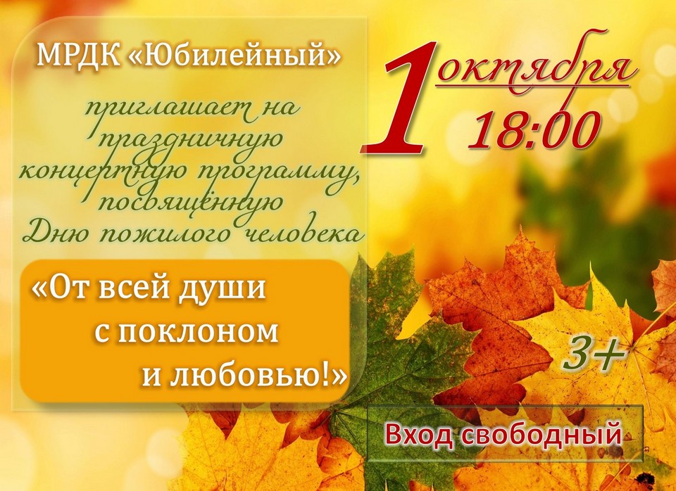 Районный дом культуры «Юбилейный» приглашает 1 октября на праздничный концерт, посвященный Дню пожилого человека, «От всей…