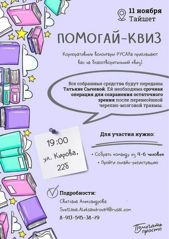 Жителей Тайшета приглашают принять участие в городском благотворительном событии «Помогай-квиз» (18+), которое состоится 11 ноября (начало…