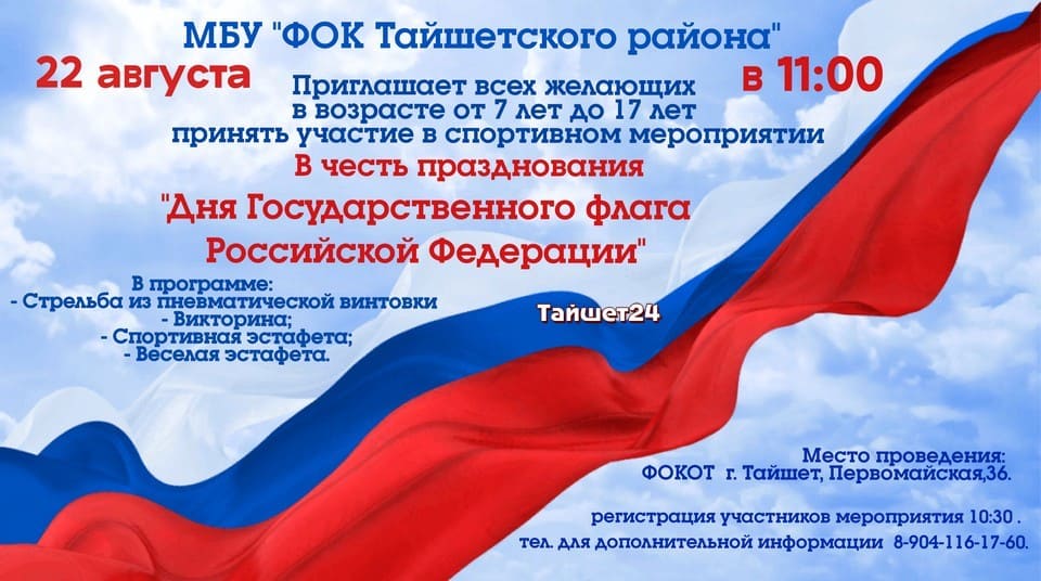 Праздник, приуроченный ко Дню государственного флага России, пройдёт в городском парке в Тайшете 22 августа (0+).…