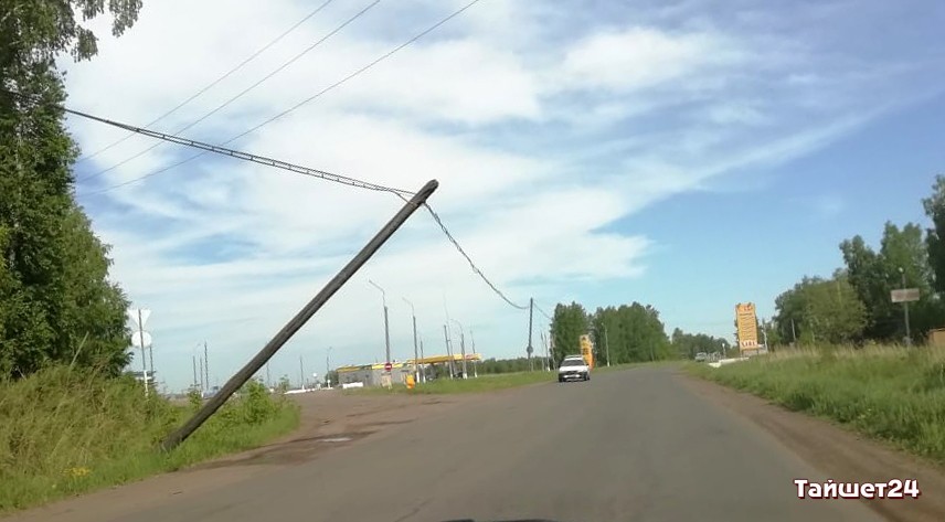 На улице Кирова в Тайшете, в районе автозаправочной станции, над дорогой угрожающе нависает деревянная опора.