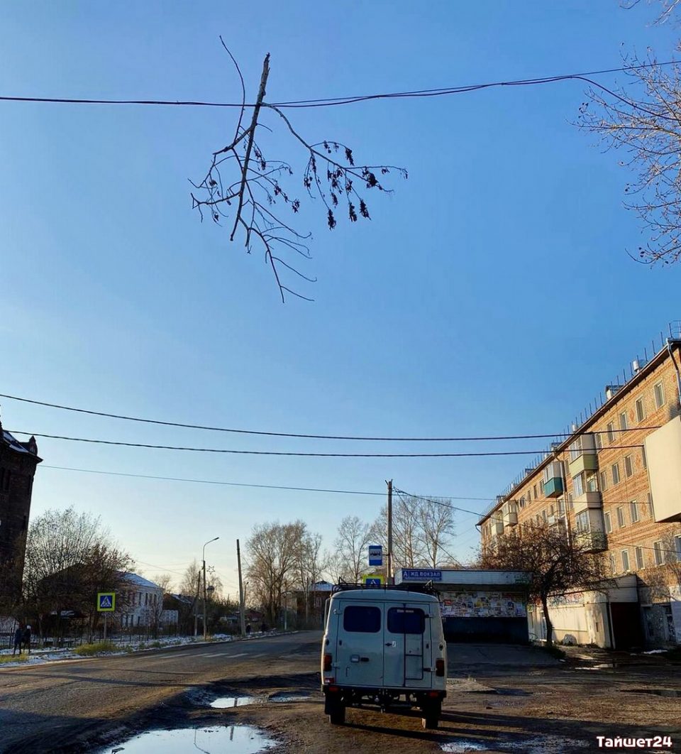 Сухая ветка уже две недели висит на проводах по улице Транспортной в Тайшете. Убирать её, судя…