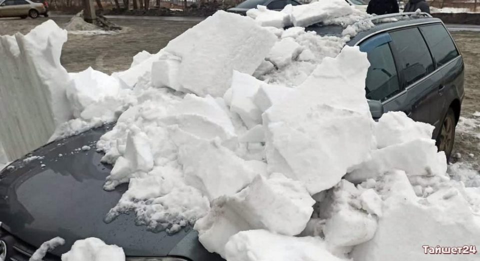 Куча снега свалилась с крыши кафе на автомобиль на улице Пушкина в Тайшете
