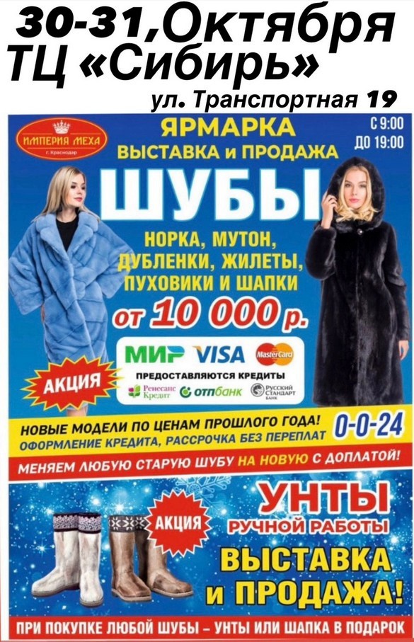 В торговом центре «Сибирь» (улица Транспортная, 19) 30-31 октября пройдёт выставка-ярмарка шуб от «Империи меха».