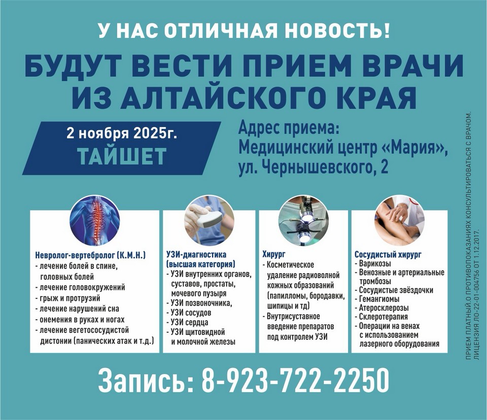 2 ноября 2025 года в Тайшете по адресу: улица Чернышевского, 2 (медицинский центр «Мария») будут вести…