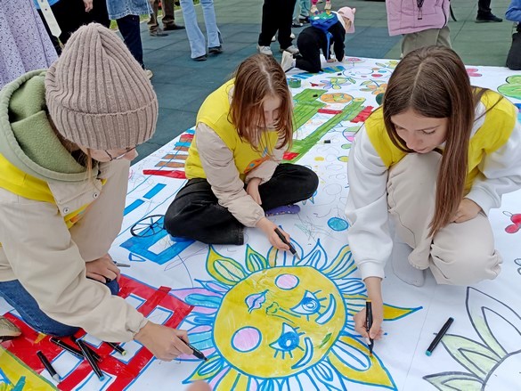 Тайшетская детская художественная школа нарисовала сегодня в парке огромную раскраску «Город моего детства».