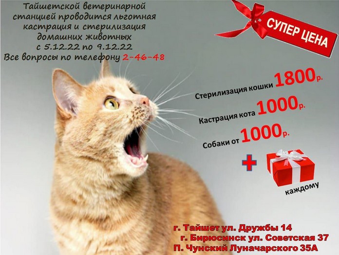 С 5 по 9 декабря включительно Тайшетская ветеринарная станция проводит льготную кастрацию и стерилизацию домашних животных.