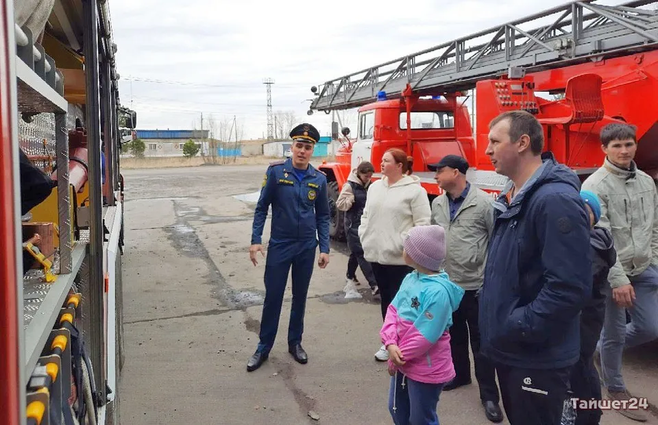 На базе 22-й пожарно-спасательной части в Тайшете работали интерактивные площадки, где взрослые со своими детьми могли познакомиться с пожарной техникой, узнать, как надевать пожарные костюмы и оказывать первую медицинскую помощь.
