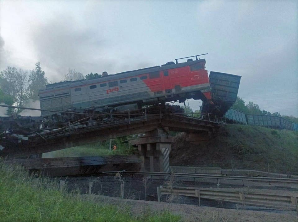 Еще один инцидент произошел ночью 1 июня в Железногорском районе Курской области: после подрыва железнодорожного моста поезд упал на автодорогу, пострадали машинист и два его помощника.