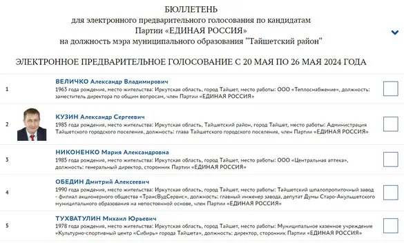 20 мая стартовало электронное предварительное голосование «Единой России». Оно позволит «партии власти» определиться с кандидатом в мэры Тайшетского района.
