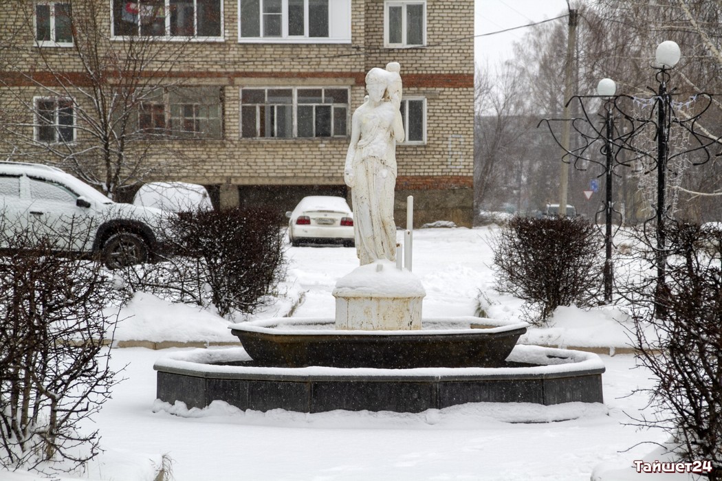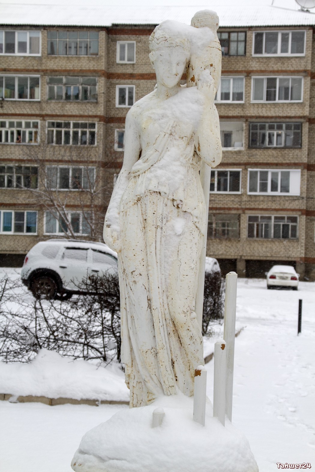 Единственная в Тайшете каменная женщина в суровую сибирскую зиму вошла в весьма неликвидной форме. Хоть и расположилась она прямо под окнами городской администрации, но у ответственных сотрудников так и не дошли руки до того, чтобы привести греческую даму в порядок.