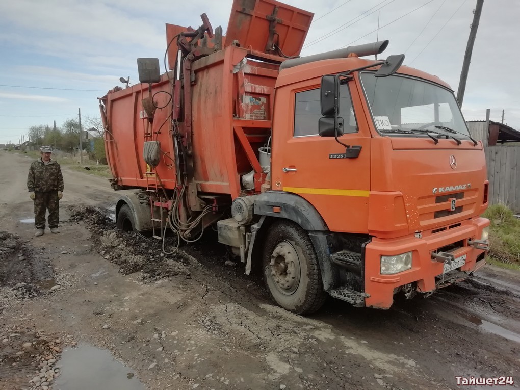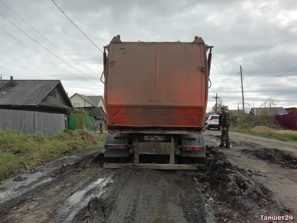 Мусоровоз застрял на улице Андреева в Тайшете, дорогу на которой вспучило, вероятно, из-за грунтовых вод. Колёса грузовика почти наполовину погрузились в «зыбучие пески».