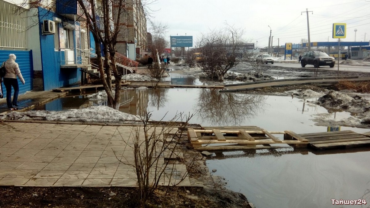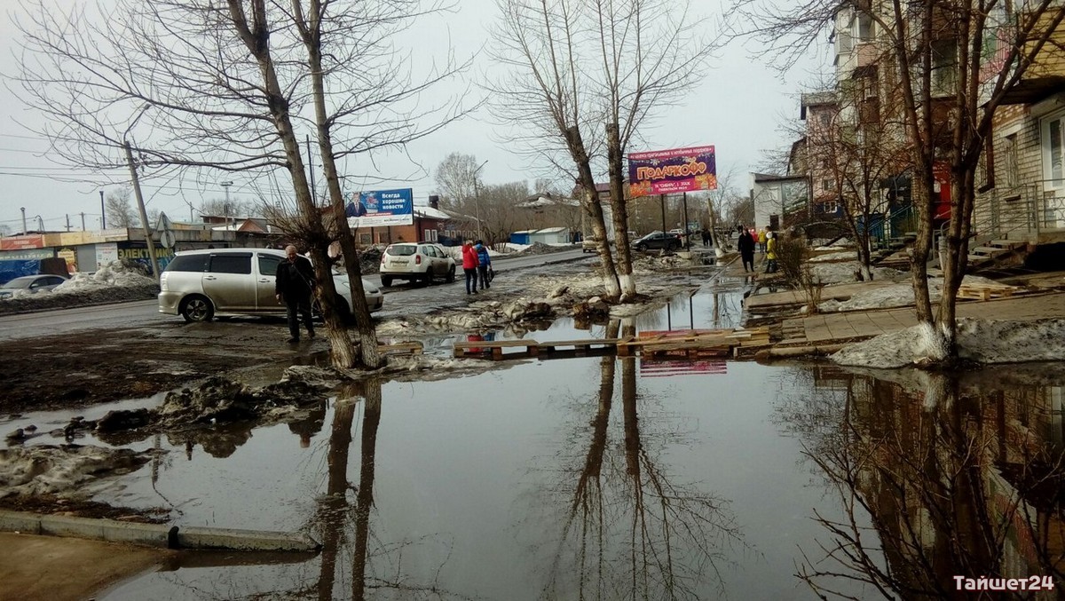 Целое море разлилось по улице Транспортной в Тайшете. Пробираться вплавь мало у кого возникает желание, поэтому пешеходам приходится, рискуя своей жизнью, идти проезжей части.