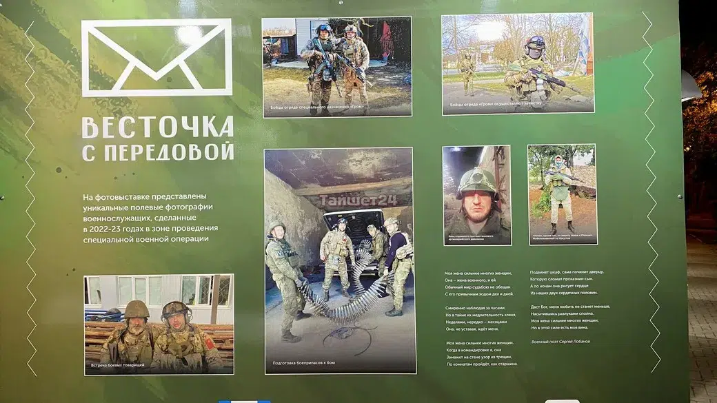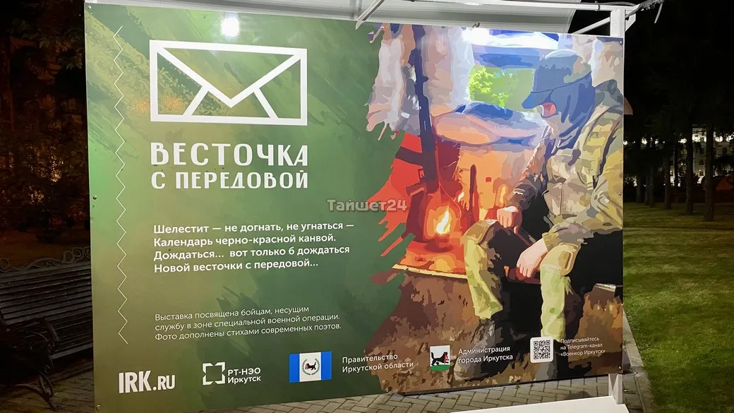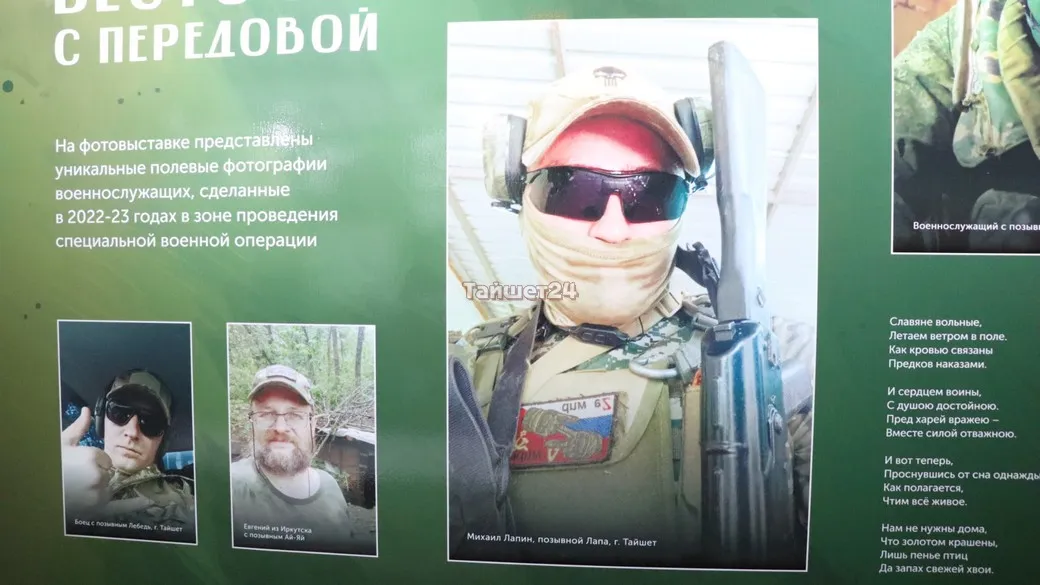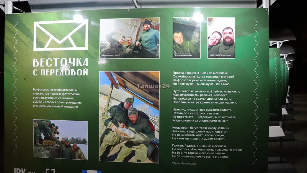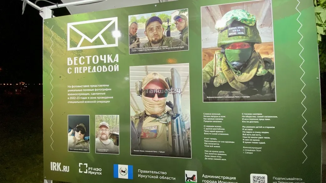 На 20 выставочных стендах, установленных в сквере имени Кирова в Иркутске, представлены полевые фотографии военнослужащих и стихотворные произведения разных эпох. В том числе и фотографии наших земляков — жителей Тайшетского района.