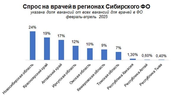 На данный момент наиболее высокий спрос на специалистов-врачей среди регионов Сибирского ФО сложился в Новосибирской области (24%), на втором месте по числу вакансий — Красноярский край (19%), на третьем — Алтайский край (17%). Всего в Сибири за указанный период работодатели открыли или обновили 9,2 тыс. вакансий для врачей.