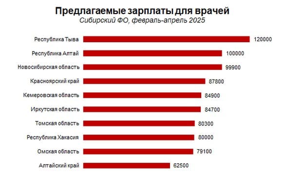 Наиболее высокие заработные платы врачам в Сибири предлагают в этом году в Республике Тыва (медиана зарплатных предложений — 120 000 руб.) и Республике Алтай (100 000 руб.). На третьем месте — Новосибирская область (99 900 руб.), на четвертом — Красноярский край (87 800 руб.), на пятом — Кемеровская область (84 900 руб.). В Иркутской области врачам предлагают 84 700 рублей в среднем. Наименее конкурентные зарплаты врачей среди сибирских регионов в Алтайском крае — 62 500 рублей в среднем.