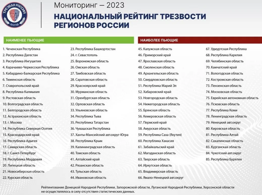 Самыми трезвыми регионами названы Чеченская Республика, Республики Дагестан, Ингушетия, Карачаево-Черкесия и Кабардино-Балкария.