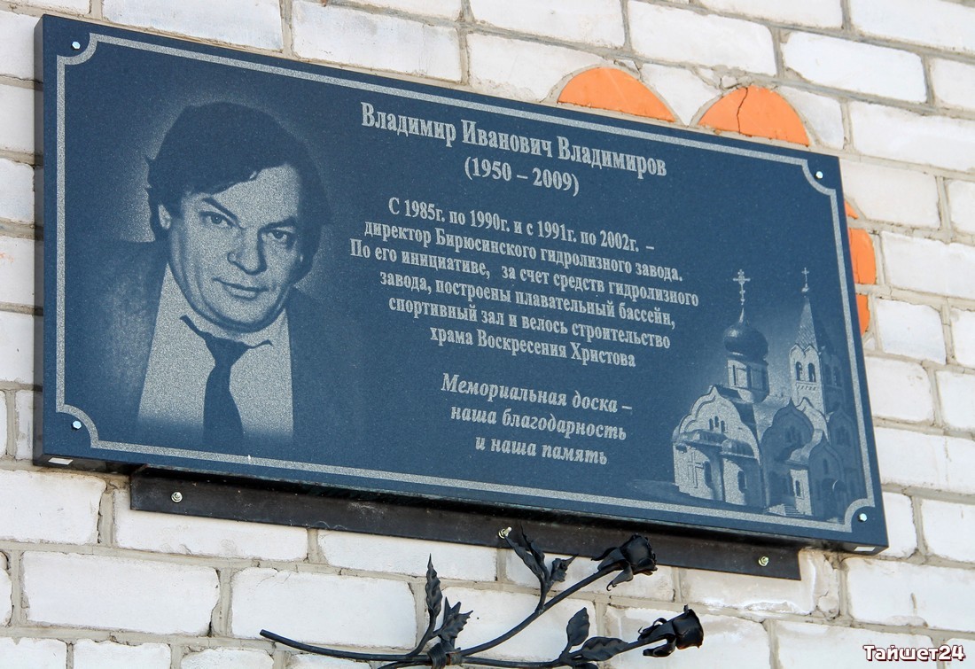 Памятная доска установлена на здании спортивного клуба «Альфа» осенью 2014 года. Он является одним из объектов, построенным на средства Бирюсинского гидролизного завода в тот период, когда его возглавлял Владимир Иванович Владимиров.