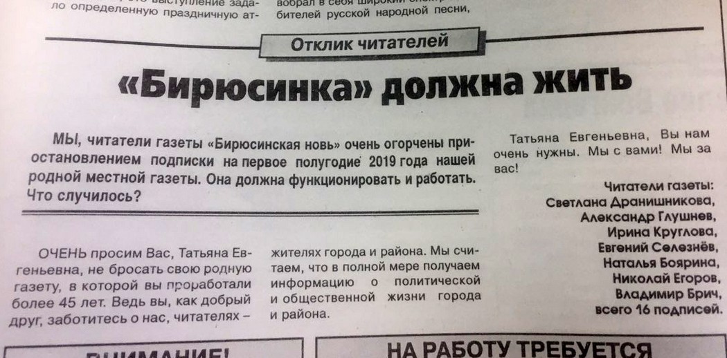 На самом деле глумиться над этой ситуацией можно сколько угодно. И до бесконечности рассуждать о полезности и бесполезности «Бирюсинской нови». Но совершенно бесспорно одно: собственное печатное издание Тайшетскому району нужно. Вне зависимости от того, какую информацию оно несёт.