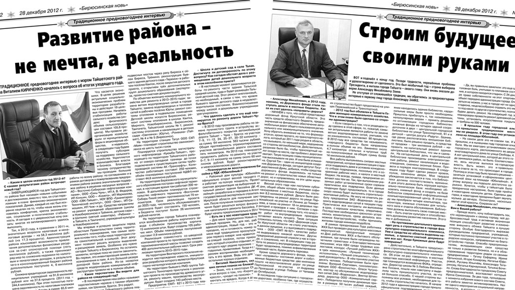 Последний номер «Бирюсинской нови» 2012 года традиционно был испещрён поздравительно-итоговыми текстами, какими-то воспоминаниями и мечтами. Как и полагается, в газете были опубликованы интервью с руководителями муниципалитетов. Предлагаем вместе с нами окунуться в прошлое и вспомнить, о чём болела голова у наших чиновников десять лет назад.