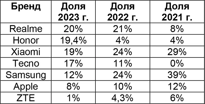 Китайские производители впервые заняли все верхние места рейтинга продаж в натуральном выражении. Следом за Realme идут Honor (19,4%) и Xiaomi (19%). Четвертое место также занимает китайский бренд Tecno с показателем 17%, далее следует Samsung (12%). Доля продаж Apple снизилась до 8%.