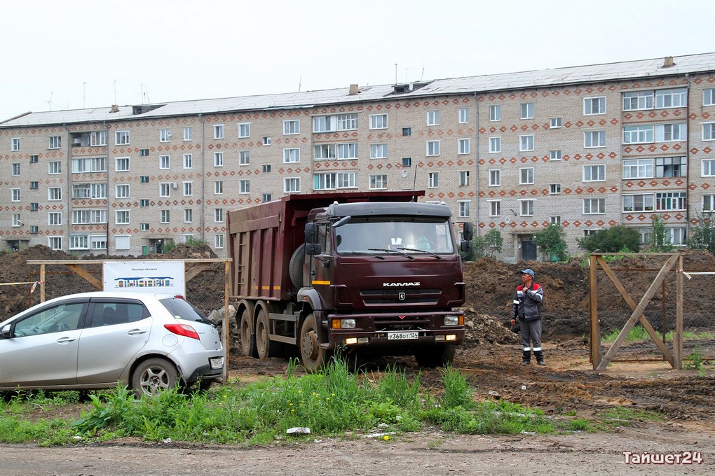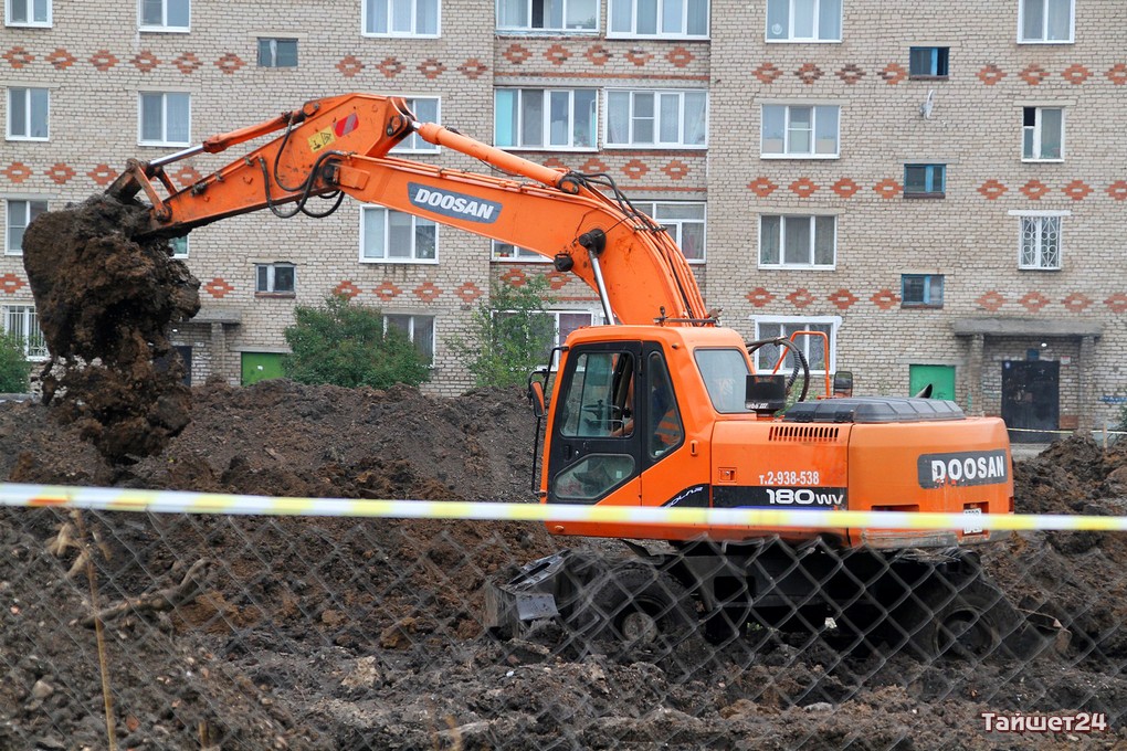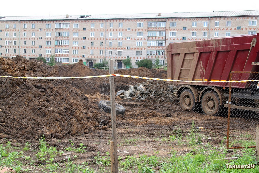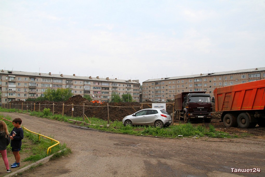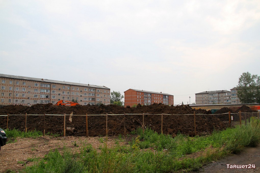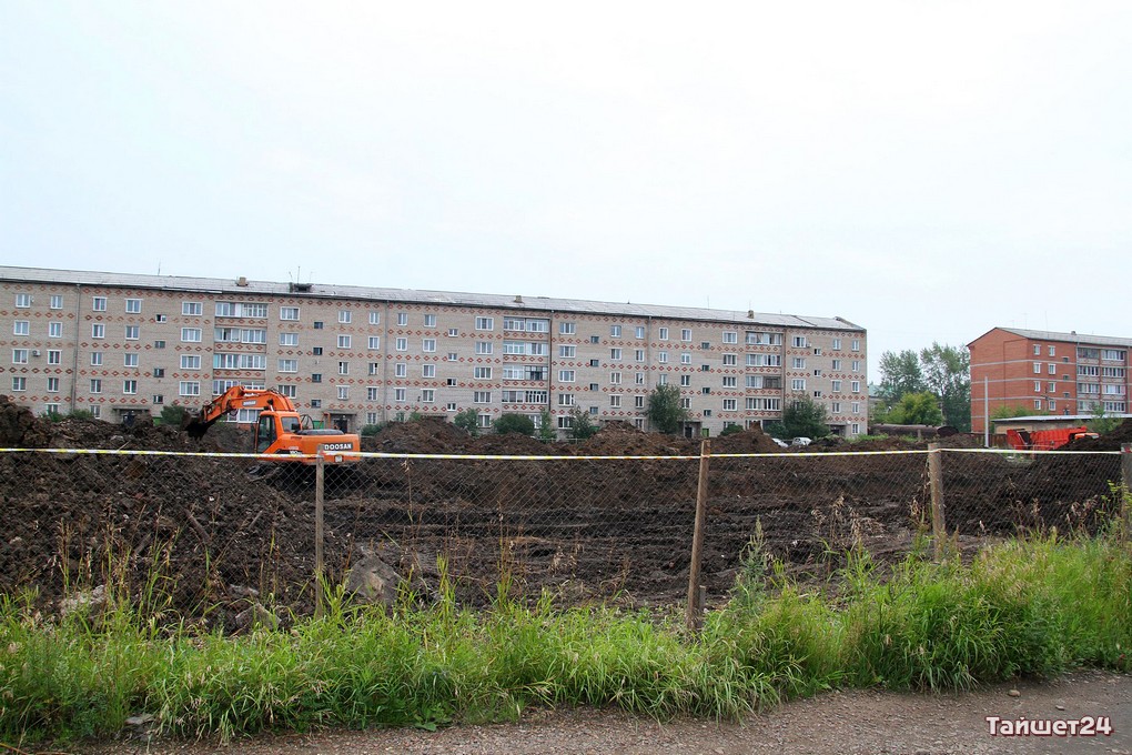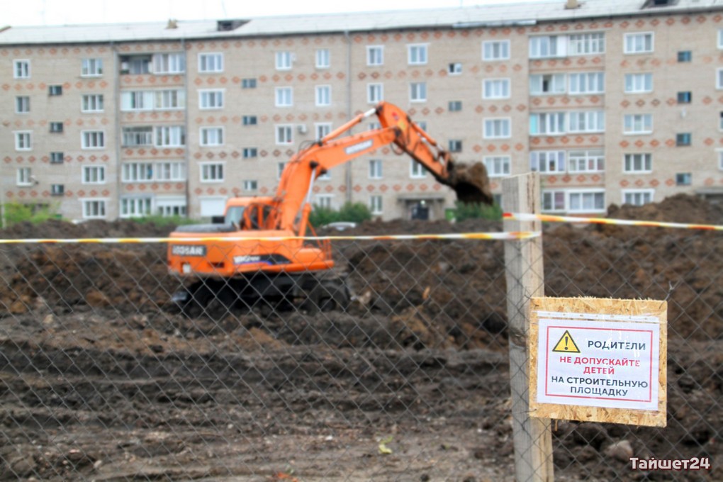 На строительной площадке во дворах домов по улице Зои Космодемьянской в Тайшете, где в итоге должен распахнуть свои двери новый детский сад, ведётся разработка котлована.