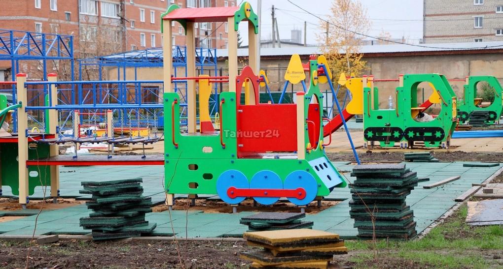 На территории будущего детского сада во дворе домов по улице Зои Космодемьянской в Тайшете устанавливают игровые площадки. Помимо качелей, каруселей и иных комплексов, на каждой площадке будет уложено современное резиновое покрытие.