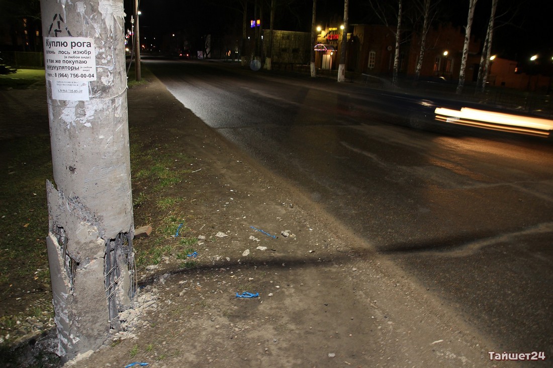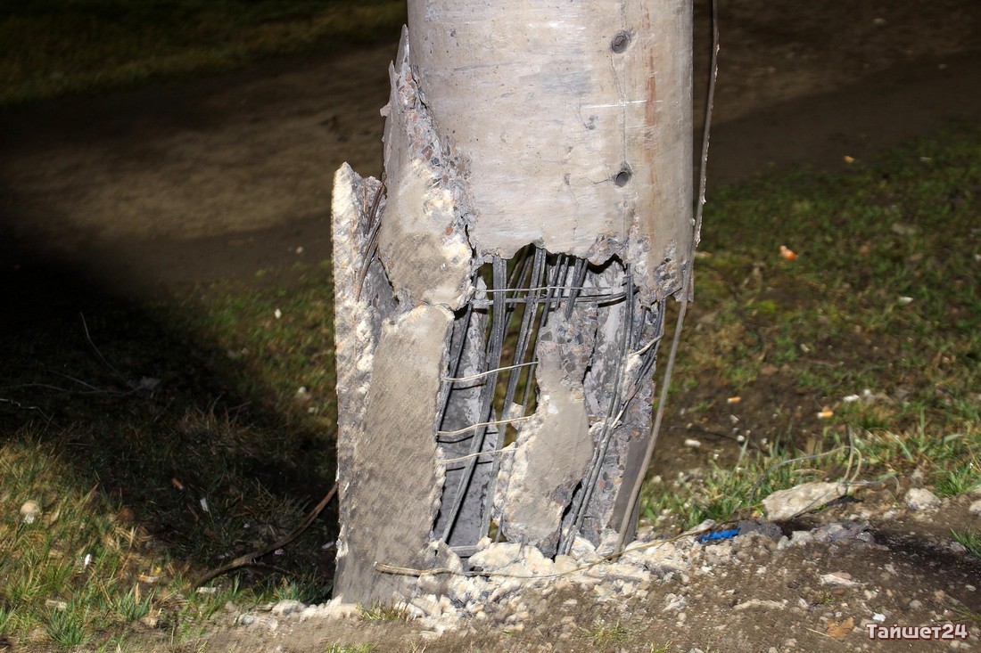 Ещё около недели назад бетонная опора линий электропередач, расположенная на пересечении улиц Гагарина и Суворова в Тайшете, получила серьёзные повреждения: в неё врезался автомобиль.