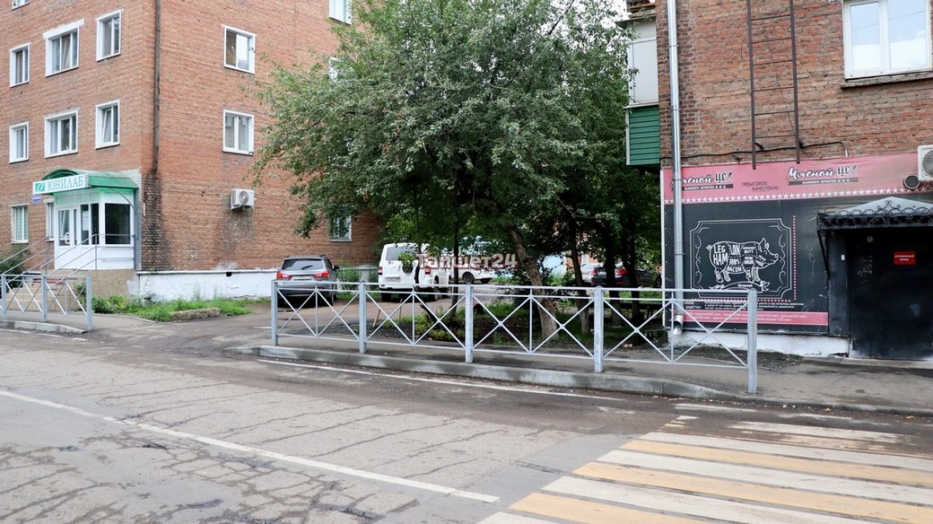 Новым пешеходным переходом «перегородили» технический вход в магазин. Ещё и ограждение установлено. Перед «зеброй» по правилам парковаться нельзя. После неё тоже не встанешь, иначе не будет тех самых законных пяти метров от въезда во двор между домами. То есть поставить машину можно только за пять метров до перехода и за пять метров до перекрёстка. Вопрос – вместится ли туда грузовик?