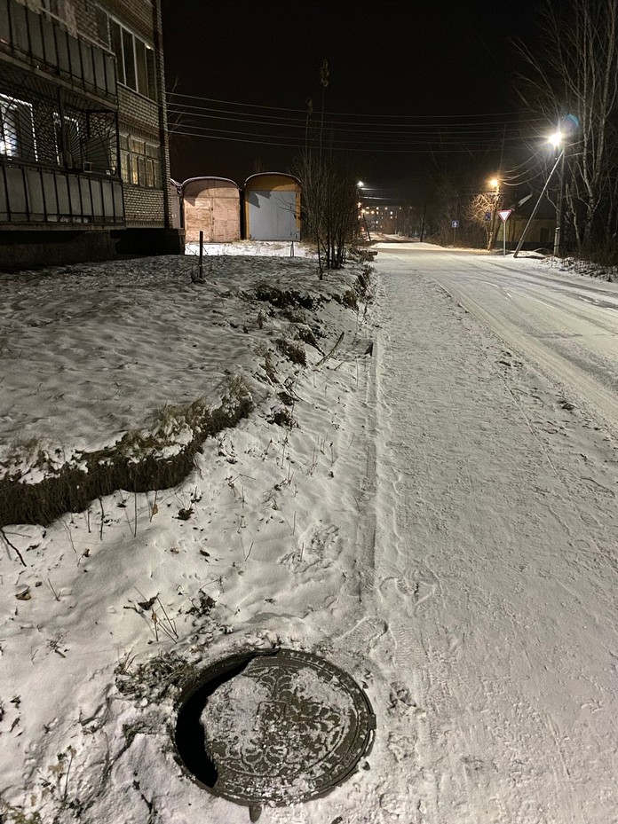 Вечером, хоть улица и немного освещена в этом месте, в него чуть не упал ребёнок! Сама крышка люка лежала в стороне, но и она не отвечает безопасности, так как сломана. Мы с мужем поставили крышку на место, но ввиду нарушения её целостности при малейшем воздействии крышка перевернётся!