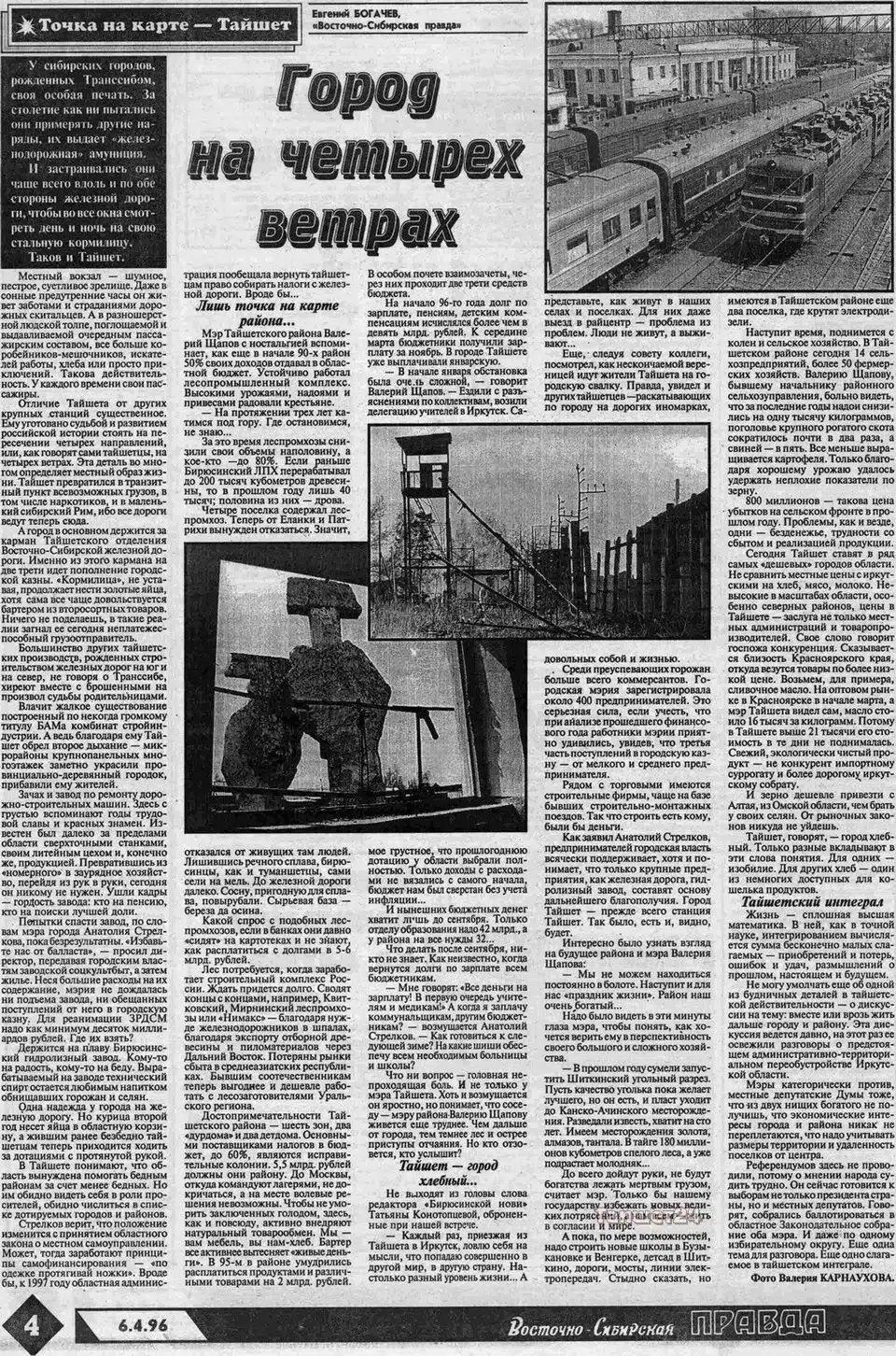 В прежние времена, когда другой была страна, другими были Тайшет и Тайшетский район, да и журналисты были не теми, что сегодня, наши края достаточно часто появлялись на страницах областных и центральных СМИ. И не в связи с происшествиями и прочими нехорошими событиями, как это происходит сегодня, а в контексте наших достижений и движения к развитию. Но в 1996 году, когда в Тайшет наведался корреспондент «Восточно-Сибирской правды» Евгений Богачёв, дела у нас шли весьма неважно. Куда хуже, чем сегодня. Об этом и статья в «ВСП» за 6 апреля 1996-го. Давайте вспомним, как это было.