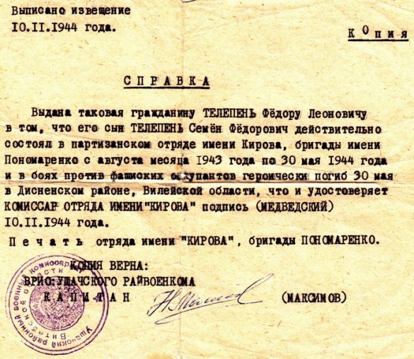 Его родные получили справку, которую хранят до сих пор: «Выдана таковая гражданину Телепень Фёдору Леоновичу в том, что его сын Телепень Семён Фёдорович действительно состоял в партизанском отряде имени Кирова, бригады имени Пономаренко с августа месяца 1943 года по 30 мая 1944 года и в боях против фашистских оккупантов героически погиб 30 мая в Дисненском районе Вилейской области, что и удостоверяет комиссар отряда имени Кирова. Подпись Медведский».