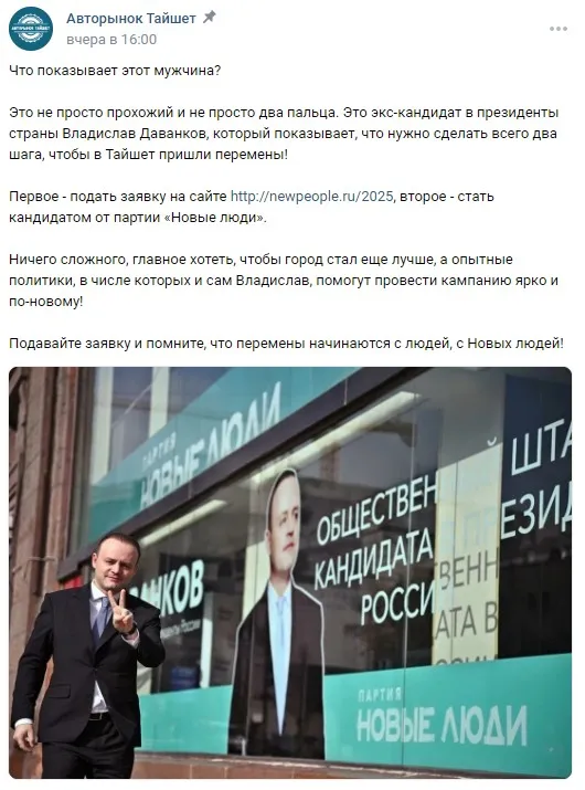 Пикантность предвыборным раскладам придаёт и то, что политическая партия «Новые люди», давно исчерпавшая ресурс своей «новизны», активно занялась поисками кандидатов на выборные должности. Например, среди тайшетцев будущего главу она ищет по объявлениям в социальной сети ВКонтакте.