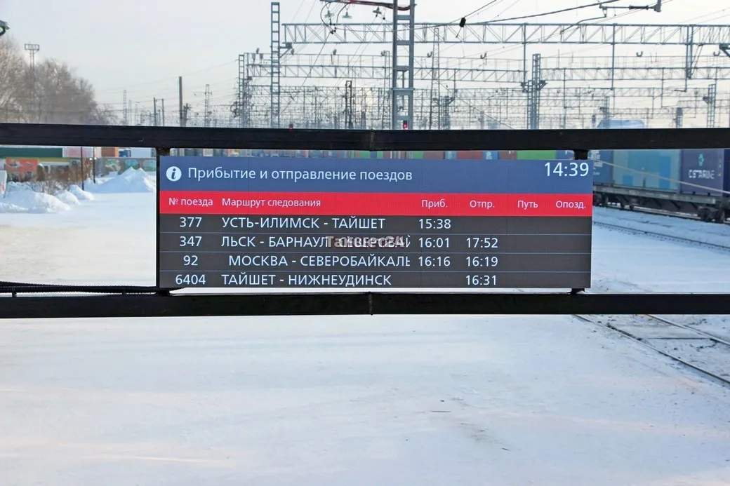 На вокзале станции Тайшет установлено шесть новых электронных информационных табло. Они расположены на каждой пассажирской платформе у спуска с виадука.