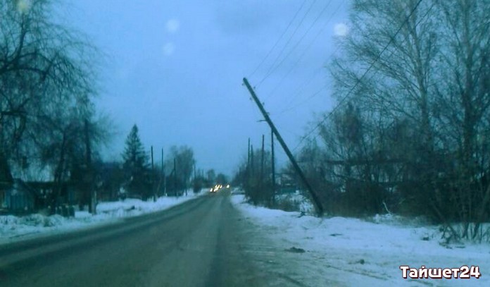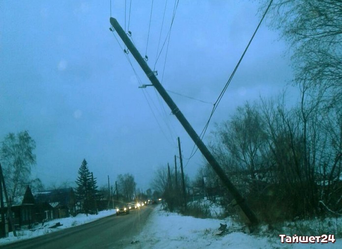 Деревянная опора линий электропередач готова в любой момент рухнуть на проезжую часть улицы Ленина в Тайшете. Очевидцы утверждают, что рядом с наклонившимся над дорогой столбом видны осколки автомобильных фар. Это даёт основания утверждать, что в опору врезался очередной ночной лихач.