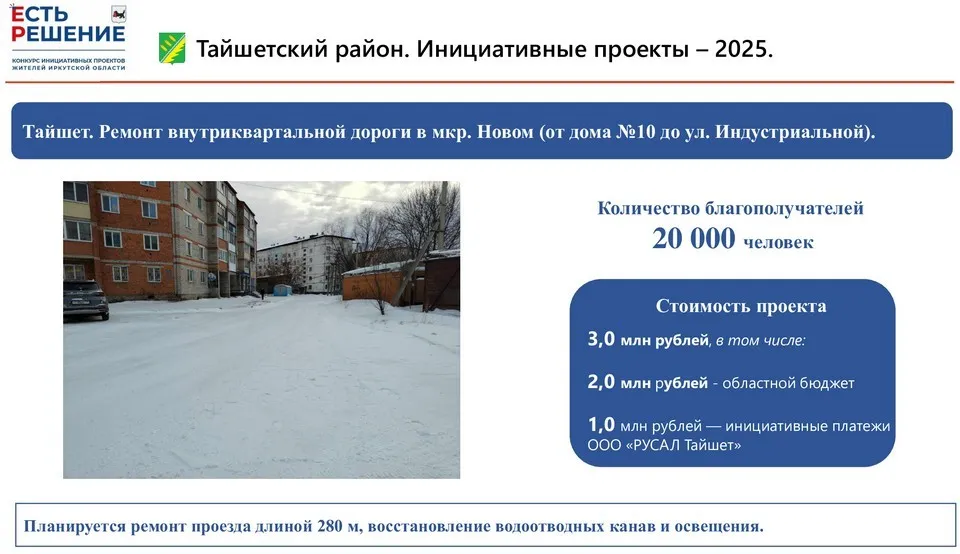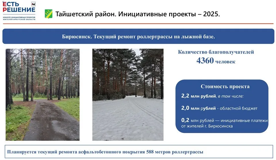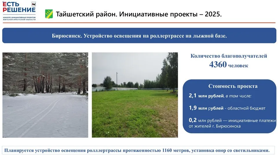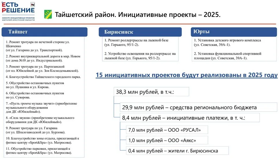 В 2025 году в Тайшетском районе будет реализовано 15 проектов на общую сумму свыше 38 миллионов рублей. Большую часть расходов взял на себя региональный бюджет — 29,9 млн рублей, 8,4 млн рублей — это инициативные платежи, которые внесли жители, предприниматели и предприятия.