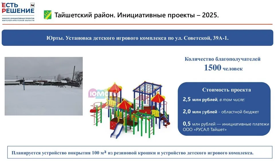 - Приобретение и устройство детского игрового комплекса по ул. Советская, 39А-1 в р.п. Юрты — 2 500 000 рублей