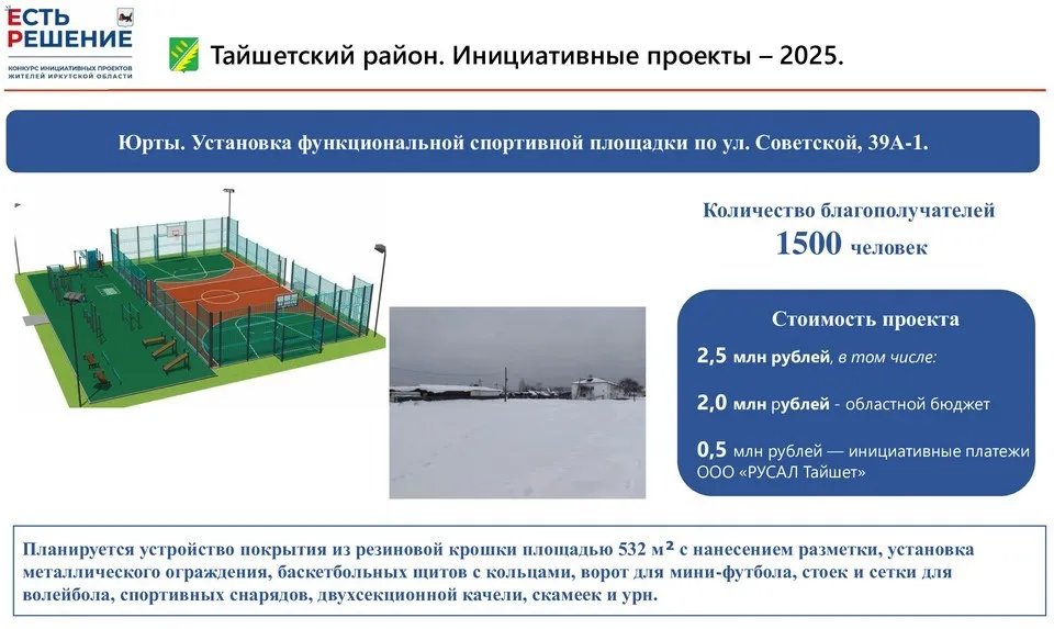 - Приобретение и устройство функциональной спортивной площадки по ул. Советская, 39А-1 в р.п. Юрты — 2 500 000 рублей