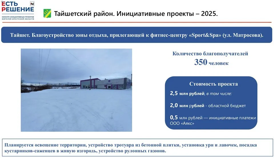 - Благоустройство зоны отдыха, прилегающей к фитнес-центру «Sport&Spa», расположенного по адресу: Тайшет, ул. Матросова, 41 — 2 500 000 рублей
