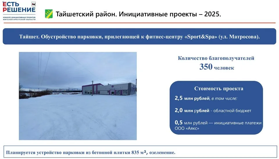 - Обустройство парковки, прилегающей к фитнес-центру «Sport&Spa», расположенного по адресу: Тайшет, ул. Матросова, 41 — 2 500 000 рублей