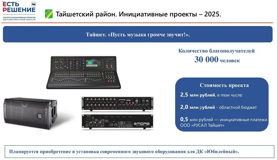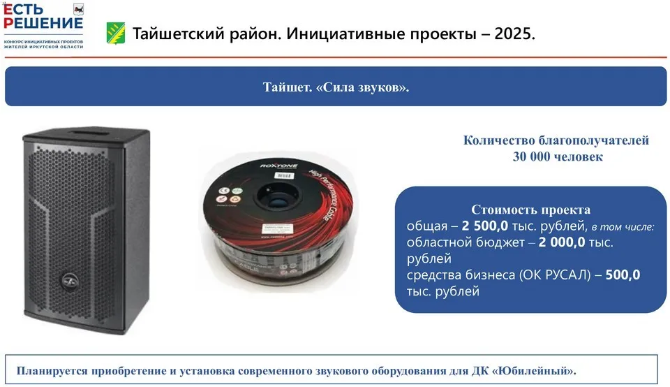 Стоит отметить, что активность жителей Тайшетского района в плане участия в конкурсе инициативных проектов год от года нарастает, и на конкурсный отбор поступает всё больше проектов. В этот раз были признаны победителями 15 проектов, которые будут реализованы на территории трёх муниципальных образований — Тайшет, Бирюсинск и Юрты. Хочется в очередной раз поблагодарить компанию РУСАЛ за оказанную поддержку в части софинансирования проектов, а также предпринимателей, которые в этом году включились в конкурсный отбор и приняли в нём участие. И, конечно же, всех наших неравнодушных, активных жителей!