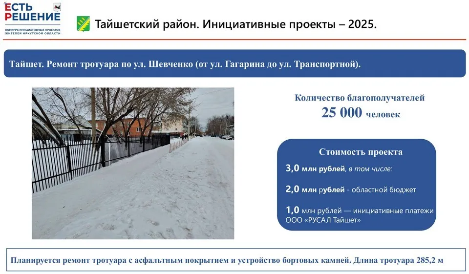 - Ремонт тротуара по нечетной стороне ул. Шевченко (от ул. Гагарина до ул. Транспортной) в Тайшете — 3 000 000 рублей