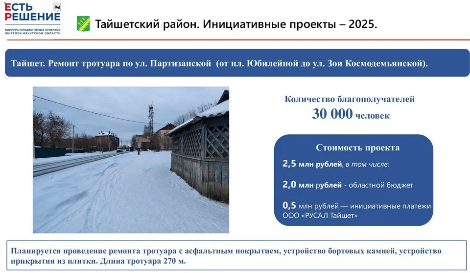 - Ремонт тротуара по нечетной стороне ул. Партизанской (от площади Юбилейной до поворота в микрорайон Новый) в Тайшете — 2 500 000 рублей