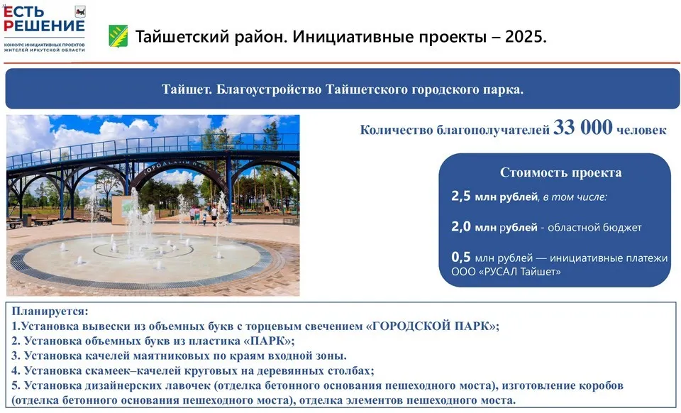 - Благоустройство Центрального городского парка по ул. Пушкина, 14 в Тайшете — 2 500 000 рублей