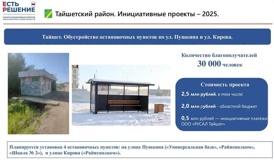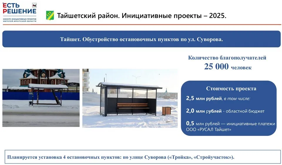 - Обустройство остановочных пунктов по маршрутам движения общественного транспорта в Тайшете — 2 500 000 рублей